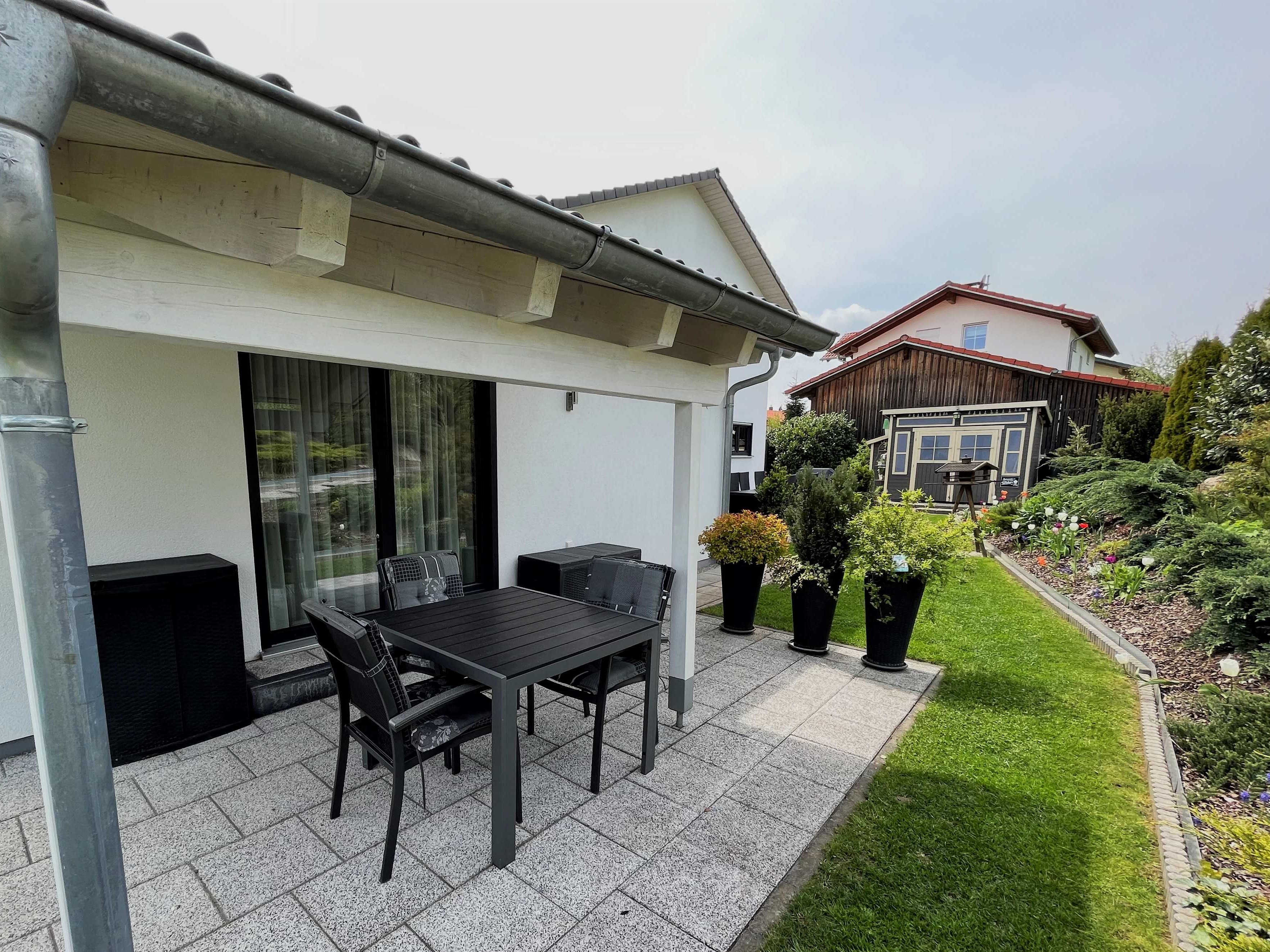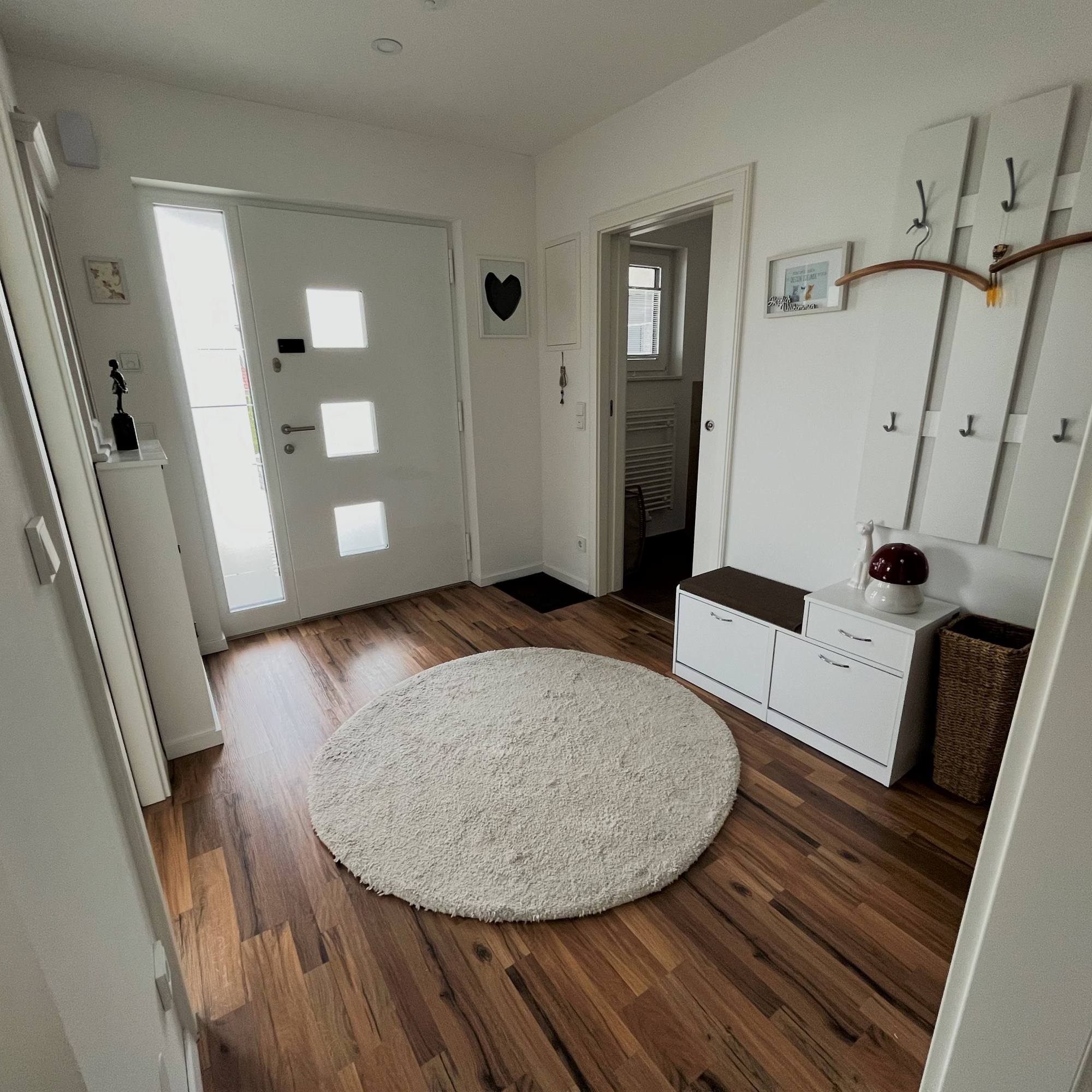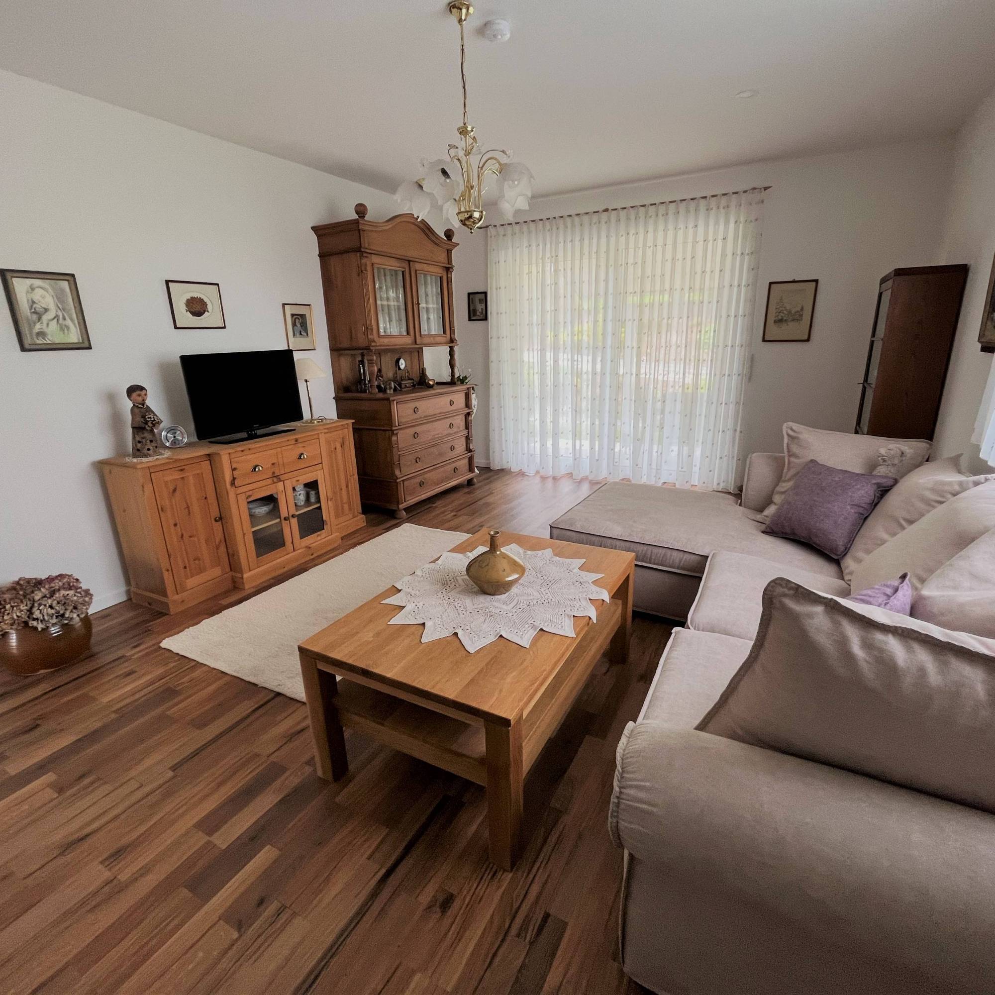 Unsere Ferienwohnung befindet sich ebenerdig in einem eigenständigen Anbau mit eigener Haustüre und toller überdachter Terrasse. Vorhanden sind: Wohnzimmer, ein Schlafzimmer, Küche, Badezimmer und Flur.
