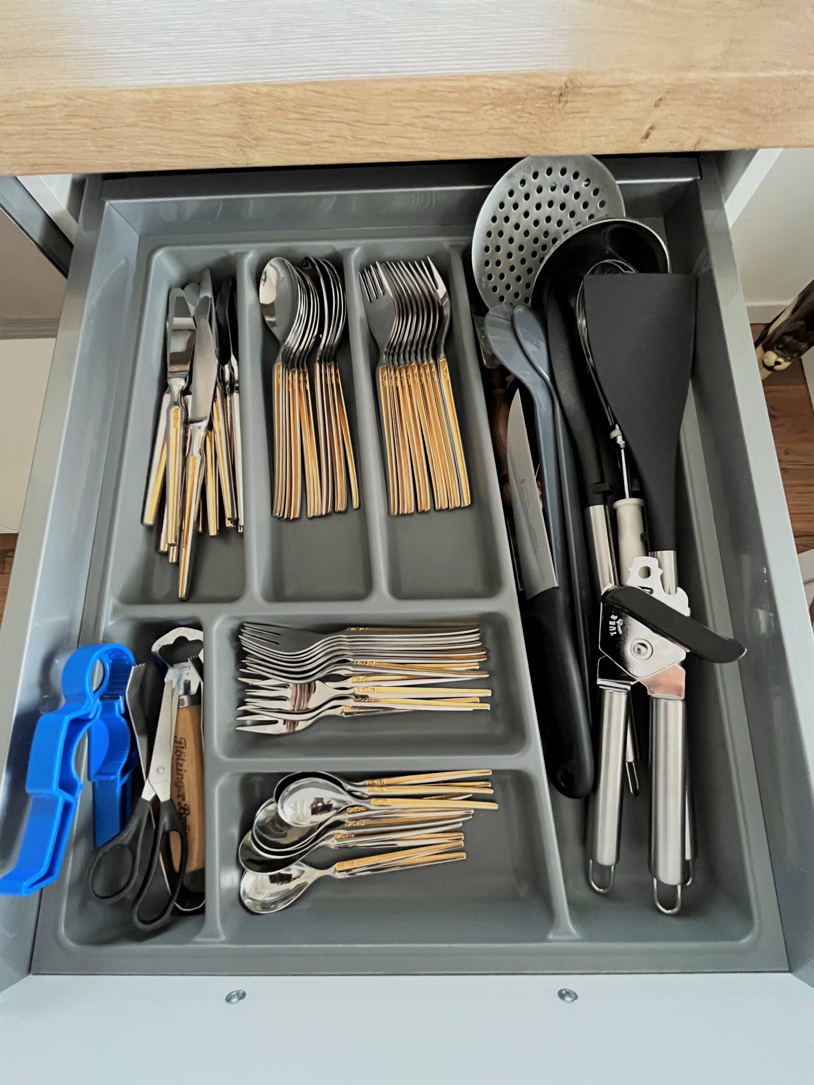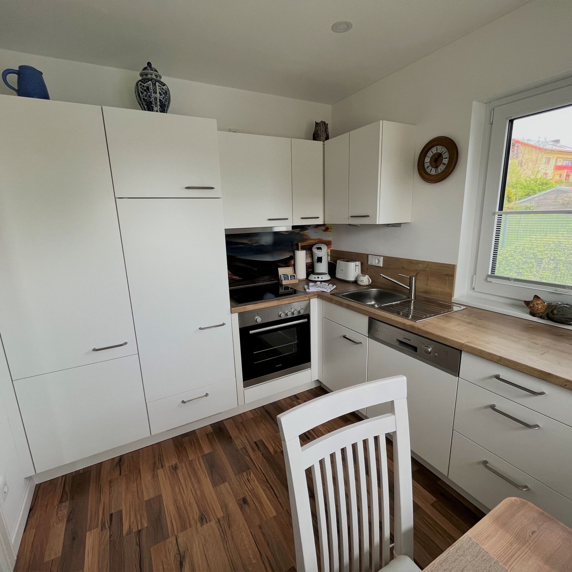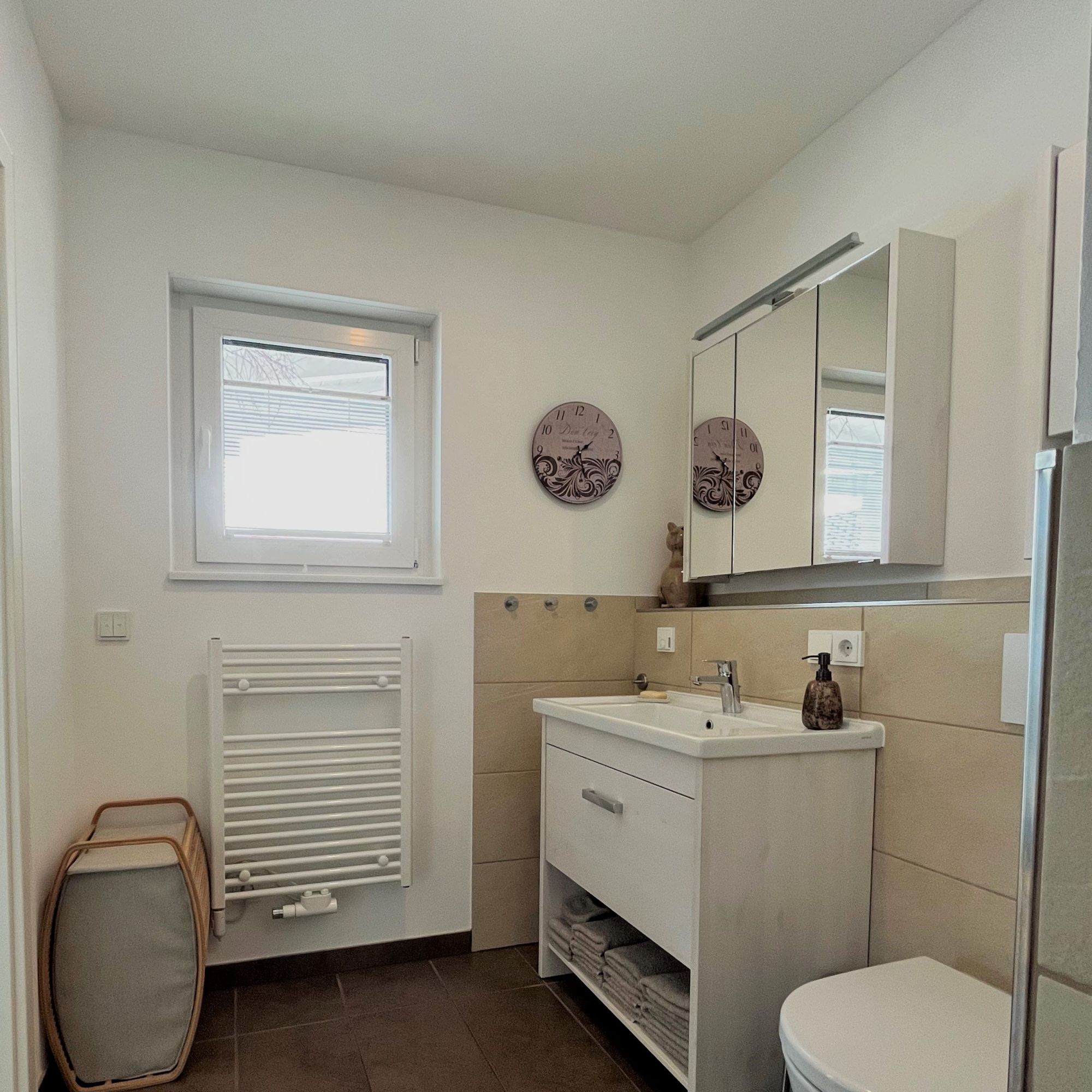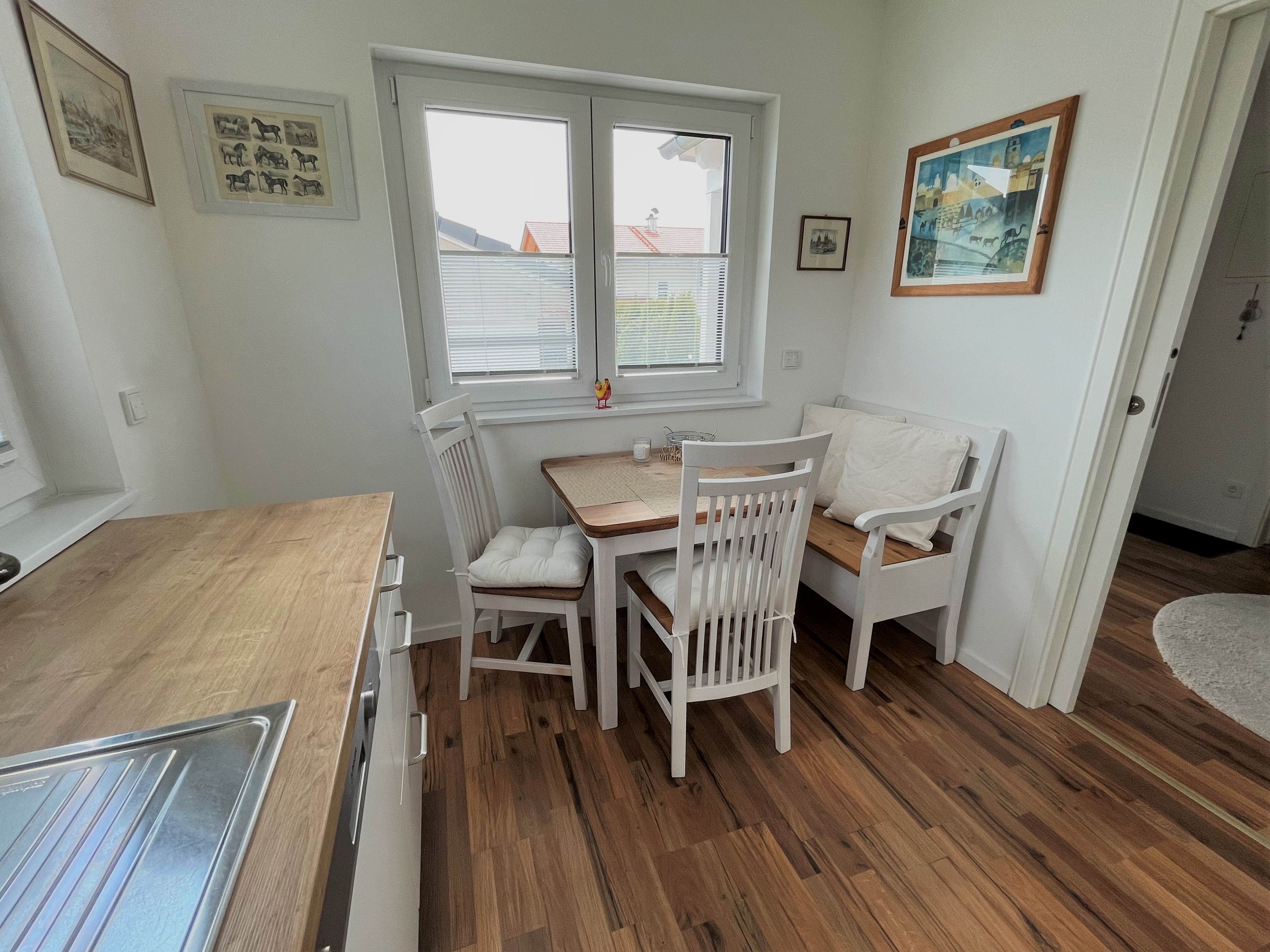 Gemütliche Küche mit Essbereich, komplett ausgestattet, Küchenutensilien, Geschirr, Gläser reichhaltig vorhanden. Im Badezimmer befindet sich eine ebenerdige Dusche, außerdem Waschbecken und WC. Hand- und Duschtücher sind inklusive.