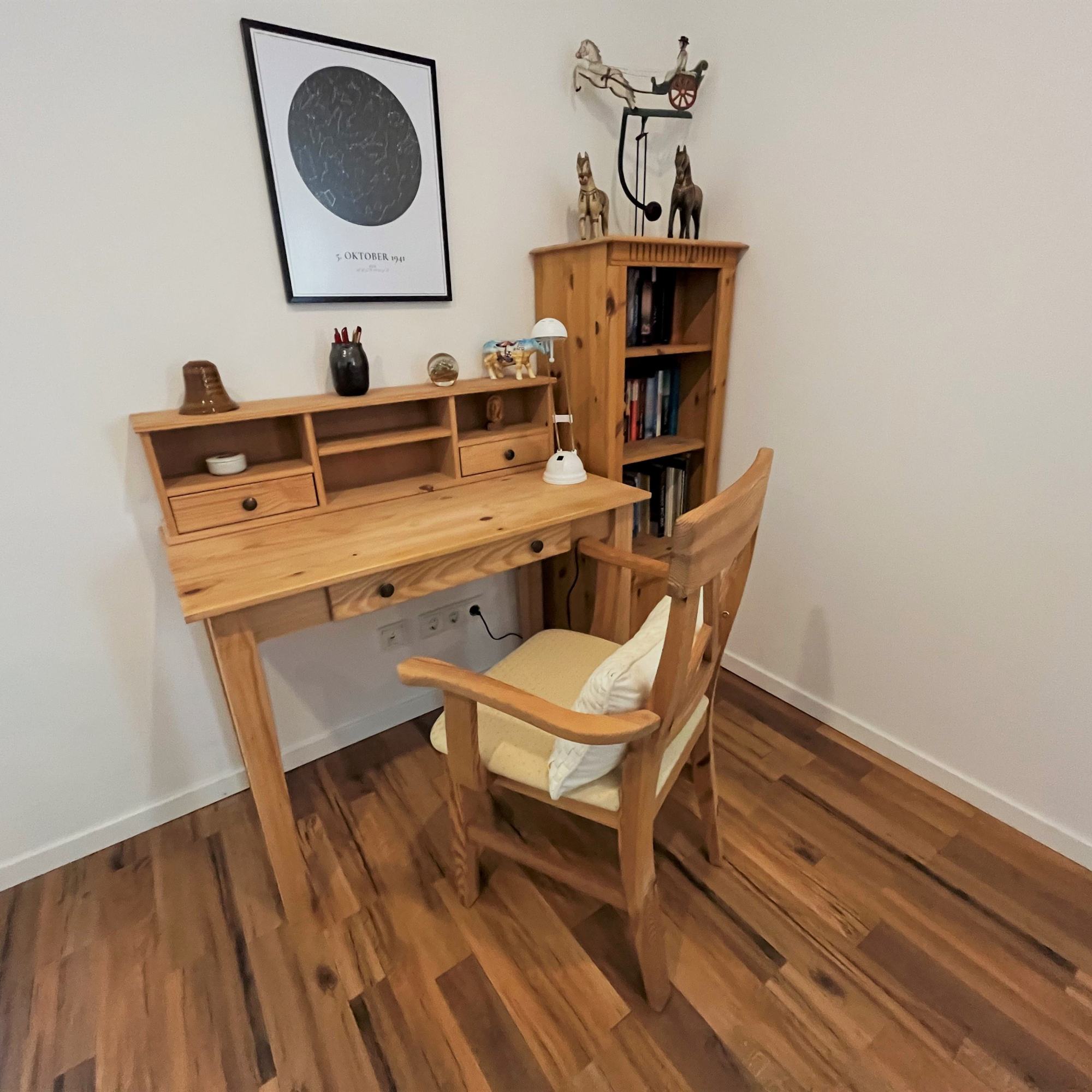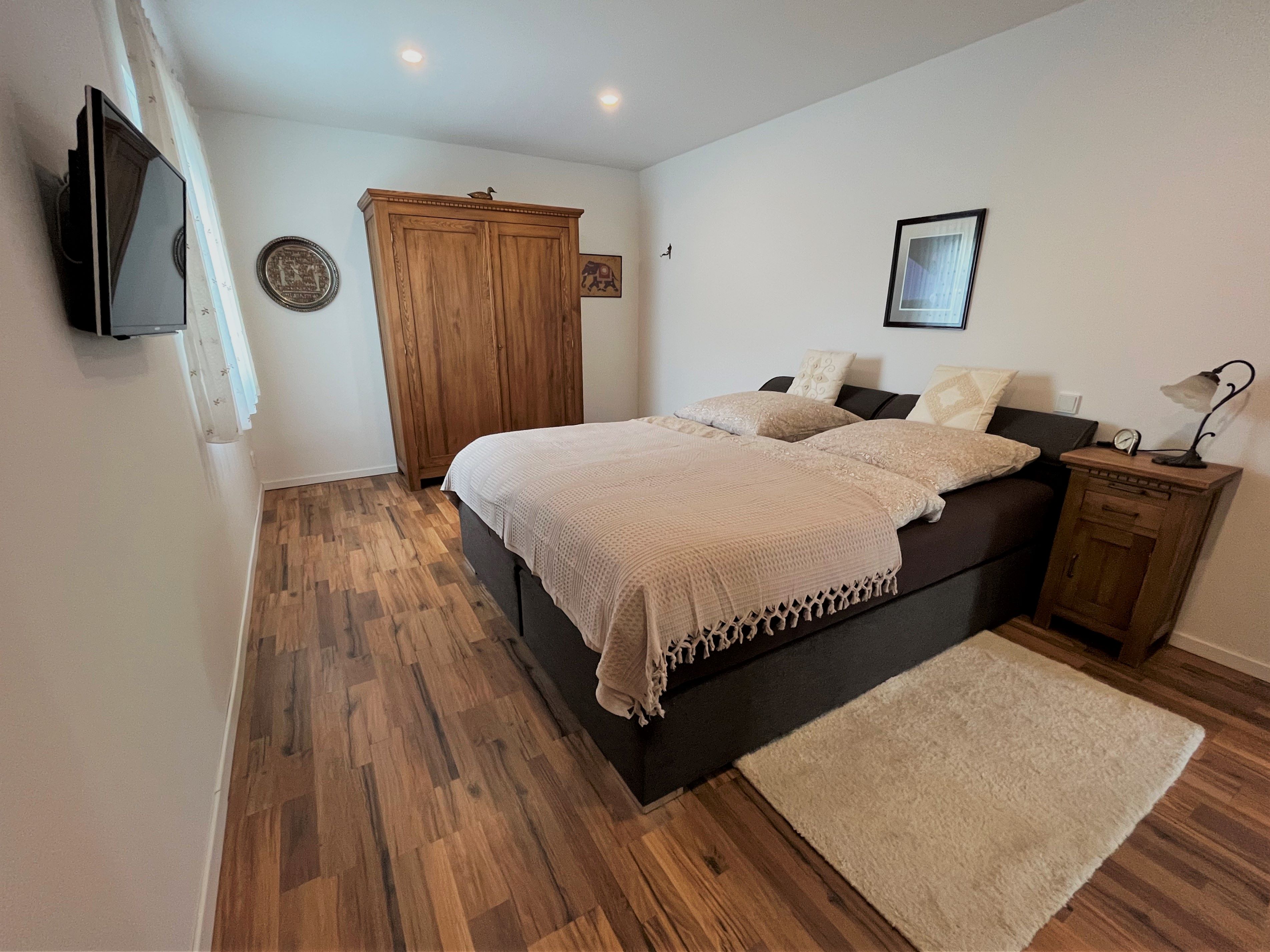 Es erwartet Sie ein modernes Boxspringbett (Breite 180 cm) mit Steckdosen in Bettnähe. Bettwäsche ist inklusive. Eine funktionelle Schreibtischecke ist vorhanden, sowie eine kleine Buchauswahl.