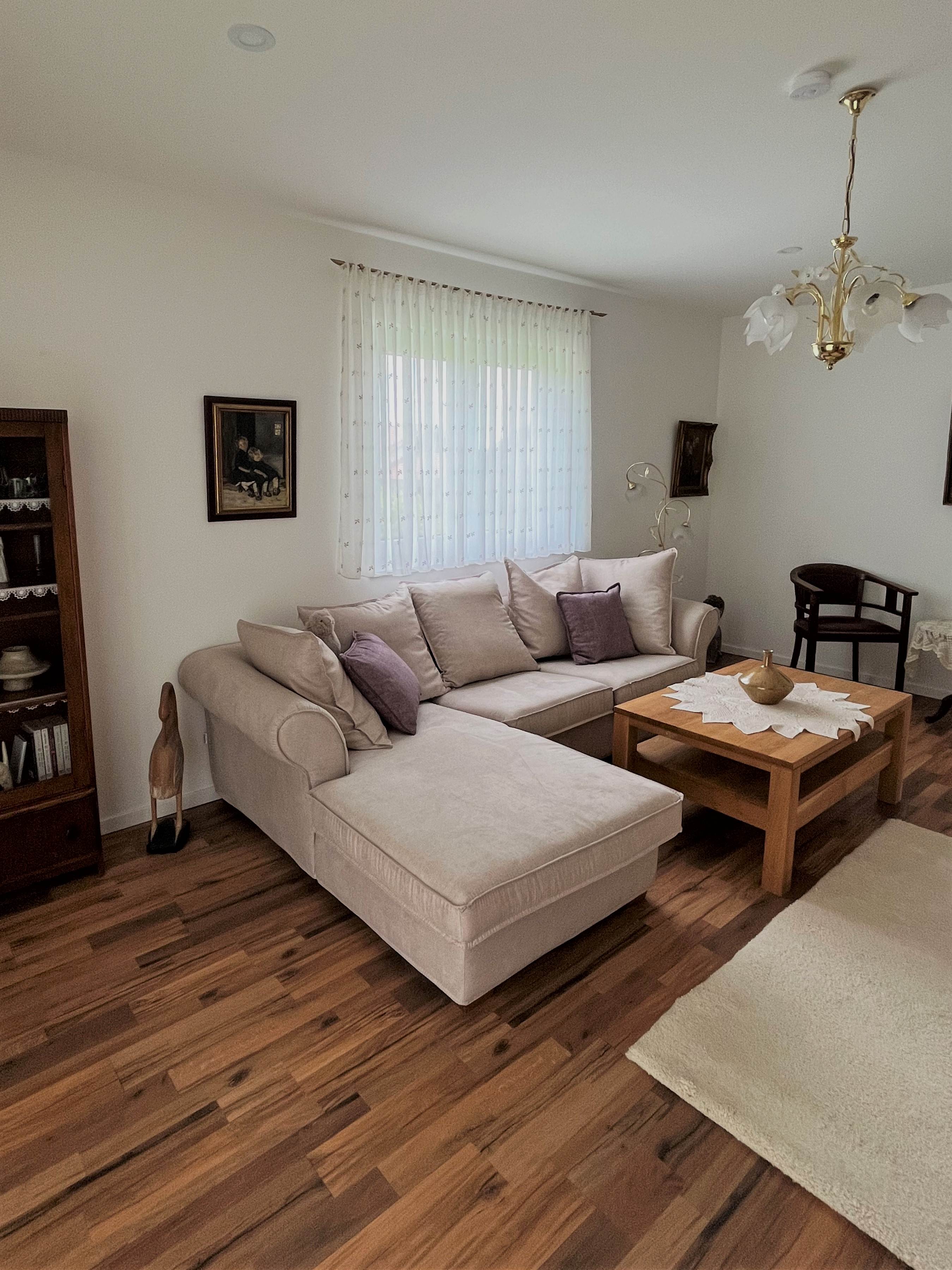 Schön eingerichtetes Wohnzimmer mit gemütlicher Couchgarnitur und Leseecke. Direkter Zugang zur Terrasse. Diese ist mit bequemen Gartenmöbeln ausgestattet. Die angrenzende Wiese lädt zum Sonnenbaden ein.